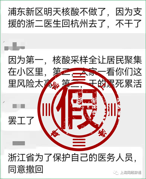 江苏省互联网举报中心据“上海网络辟谣”消息 近日,一张主题为“支援上海做核酸的浙二医生回杭州去了,不干了”的聊天对话截屏在圈群传播。由于部分小区核酸筛查时间进行了调整,不少市民希望了解聊天记录的可信度,向上海辟谣平台留言询问。 经上海辟谣平台多方核实,可判定聊天记录是谣言。 4月2日,上海市疫情防控工作领导小组办公室相关部门答复上海辟谣平台,网传“浙江医护撤回”系明确谣言,浙江相关部门已开展网上谣言处置。目前,浙江援沪队伍采取轮换制,明确持续援助上海开展工作。