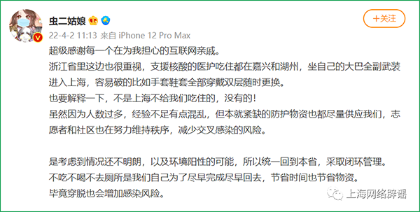 也有参与支援上海的浙江医护人员主动通过微博等社交平台发声,澄清网传“浙江医护不住上海”“没吃没喝”的谣言。 微博网友“虫二姑娘”是支援上海的浙江医护人员之一。4月2日,她在微博上发表长文解释了为何部分浙江医护人员没有住在上海、不在工作时间段中吃东西的原因: “超级感谢每一个在为我担心的互联网亲戚。 浙江省里这边也很重视,支援核酸的医护吃住都在嘉兴和湖州,坐自己的大巴全副武装进入上海,容易破的比如手套鞋套全部穿戴双层随时更换。 也要解释一下,不是上海不给我们吃住的,没有的! 虽然因为人数过多,经验不足有点混乱,但本就紧缺的防护物资也都尽量供应我们,志愿者和社区也在努力维持秩序,减少交叉感染的风险。 是考虑到情况还不明朗,以及环境阳性的可能,所以统一回到本省,采取闭环管理。 不吃不喝不去厕所是我们自己为了尽早完成尽早回去,节省时间也节省物资。 毕竟穿脱也会增加感染风险。”