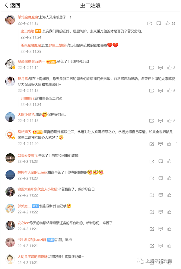 面对浙江医护人员的帮助,上海市民也表示感谢。很多网友看到了“虫二姑娘”的发文后,纷纷留言,介绍了自己刚刚接受浙江医护人员的服务,并表达感激之情。 例如,网友“那月雪”表示,“身在上海闵行,昨天是浙二医的同志们来帮我们做核酸,非常感恩和感动,希望在上海的大家都能尽力配合好大白和志愿者们~” 网友“擎天-兔”说,“坐标塘桥,是浙一的医生来做的,谢谢谢谢”。 网友“安之lee”说,“昨天的核酸结果是浙江省平台出的,感谢你们,辛苦了!” 更多的网友给以“虫二姑娘”为代表的浙江医护人员留言,表示“辛苦了!向您和同事们致敬!”“来支援的都要感恩”“辛苦了!保护好自己!”