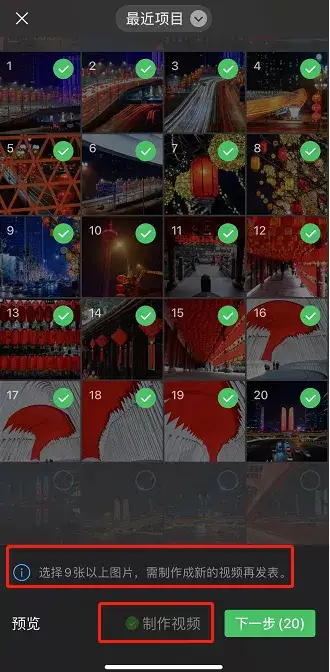 本次更新后,发朋友圈时可以选择 9 张以上图片,但是微信会要求将图片转制成小视频: ' D' J! [" ]( J: u9 Y. c1 m- N' E